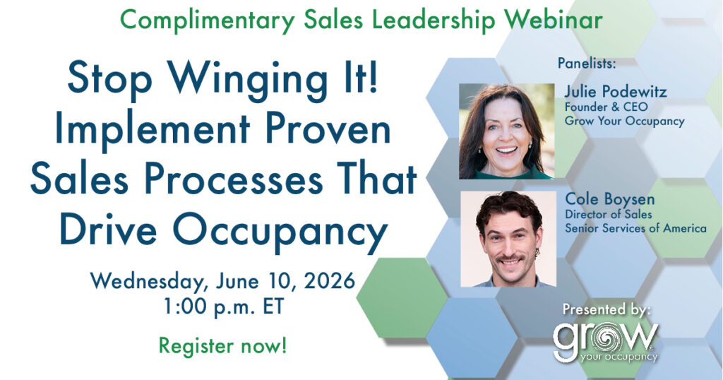 “We hired Grow Your Occupancy to do a sales leadership training workshop for our Executive Directors. Julie provided great role-playing exercises that drove engagement and raised the team’s overall sales acumen. After the training we had some Executive Directors commit to spending at least 3 hours a week on outreach. It definitely hit home.”